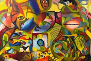 Op de receptie ben je ook welkom om de kleurrijke schilderijen van Jan Kortekaas te bekijken die zijn tentoongesteld in de Bosduivel.